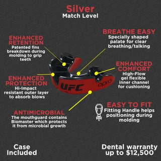 Il Paradenti bambino Opro x UFC Silver Rosso-nero è un paradenti ad arcata singola sviluppato per i fighter più giovani. Nato dalla collaborazione tra OPRO e UFC, questa edizione "Silver" offre una protezione perfetta per i tuoi denti. Questa versione "Junior" è consigliata fino a circa 11 anni di età.